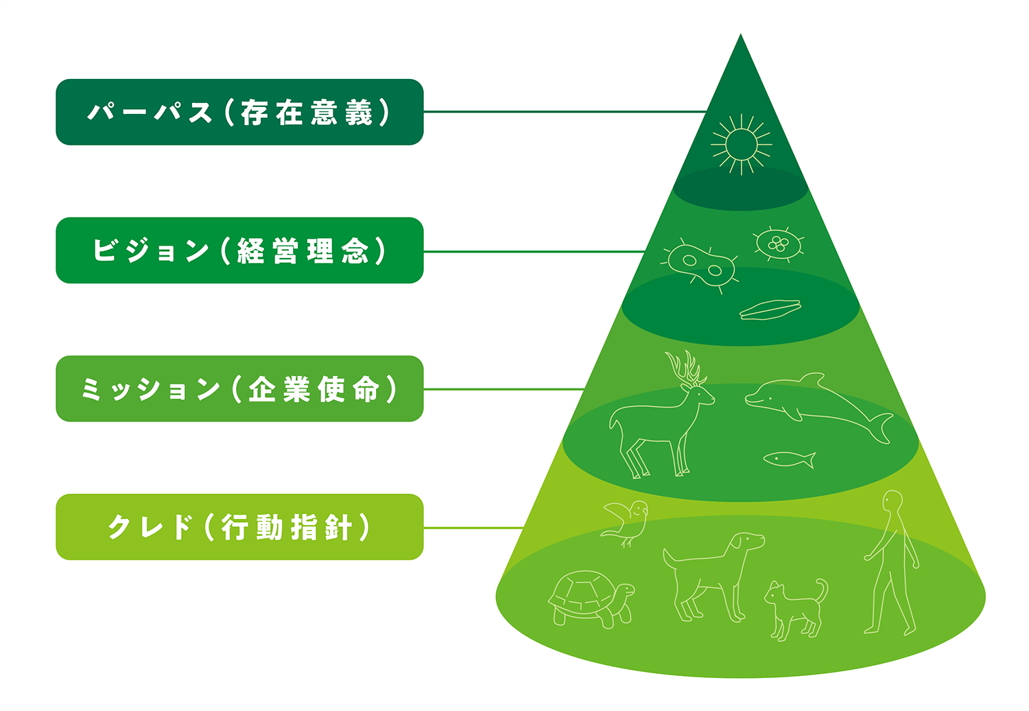 グループ理念体系は、経営の最上位概念であり、「パーパス(存在意義)、ビジョン(経営理念)、ミッション(企業使命)、クレド(行動指針)」から構成されています。